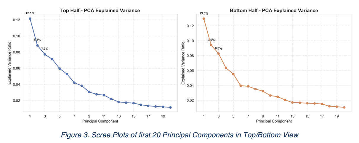 $$ \Sigma_{top} = \frac{1}{N-1} X_{top}^T X_{top} \in \mathbb{R}^{392 \times 392} $$Solving the eigenvalue problem $\Sigma_{top}v = \lambda v$ gives the eigenvectors. We select the top 5 eigenvectors corresponding to the largest eigenvalues to form the projection matrix $P_{top}$ such that: $P_{top} = [v_1, v_2, \ldots, v_5] \in \mathbb{R}^{392 \times 5}$.