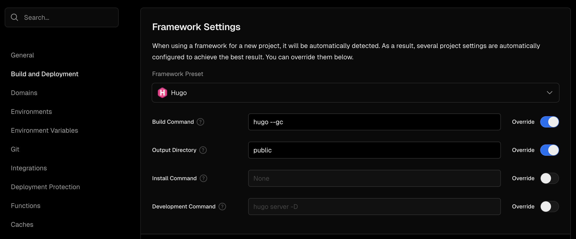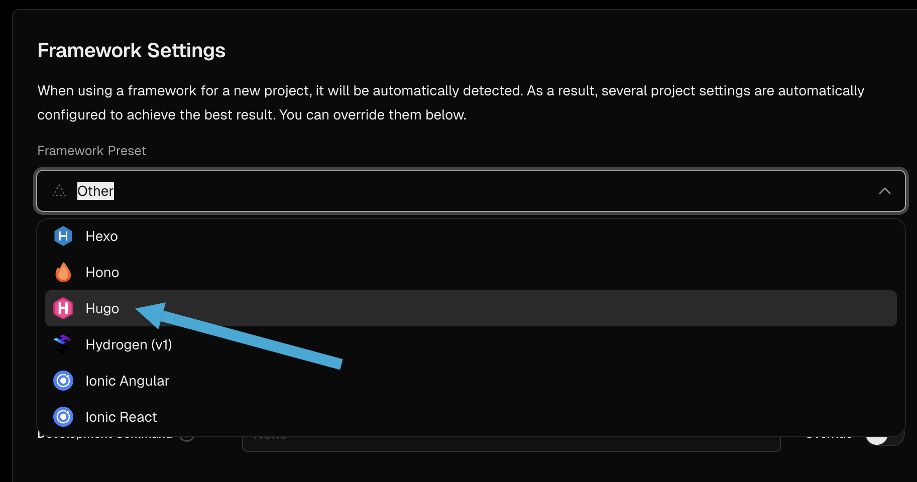 In Build and Development Settings, set Framework Preset to Hugo: