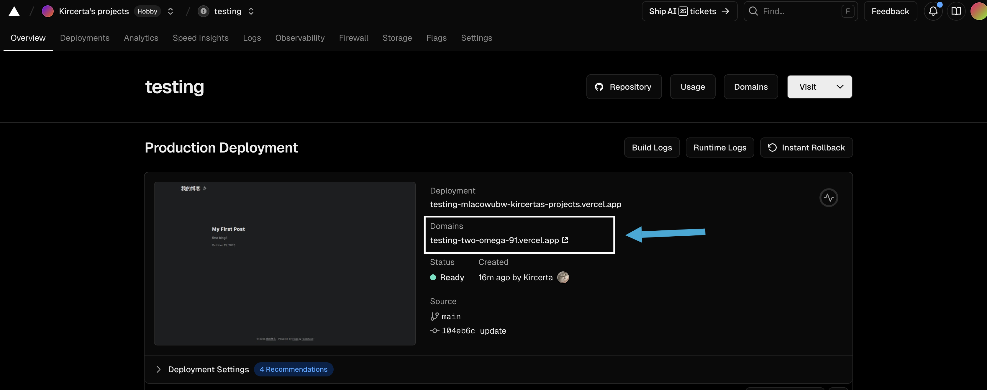 Finally, update `baseURL` in `hugo.toml` to the URL Vercel generated for your deployment: