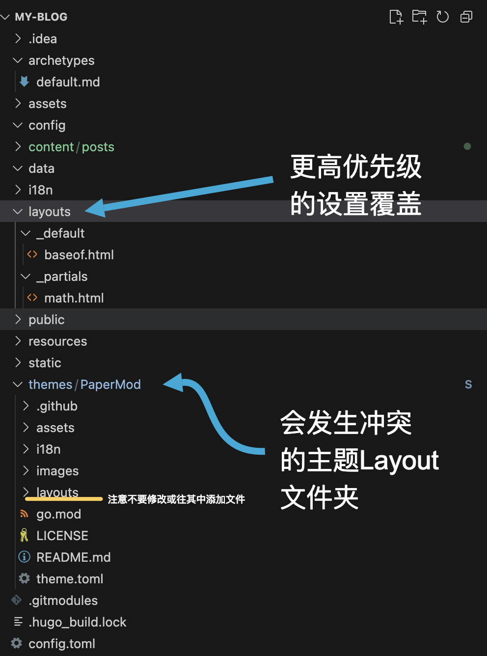 那么该如何解决呢?我们可以在自己的网页项目根目录中找到比theme更上一层的文件夹layouts。这个layout中我们所加入的设置,会以比theme中layout里设置更高优先级的形式,在网页部署和render时被采纳。因此,你所加入的新文件和更改都可以在不破坏PaperMod或者其它你所安装的主题的情况下被加载,也就是override。