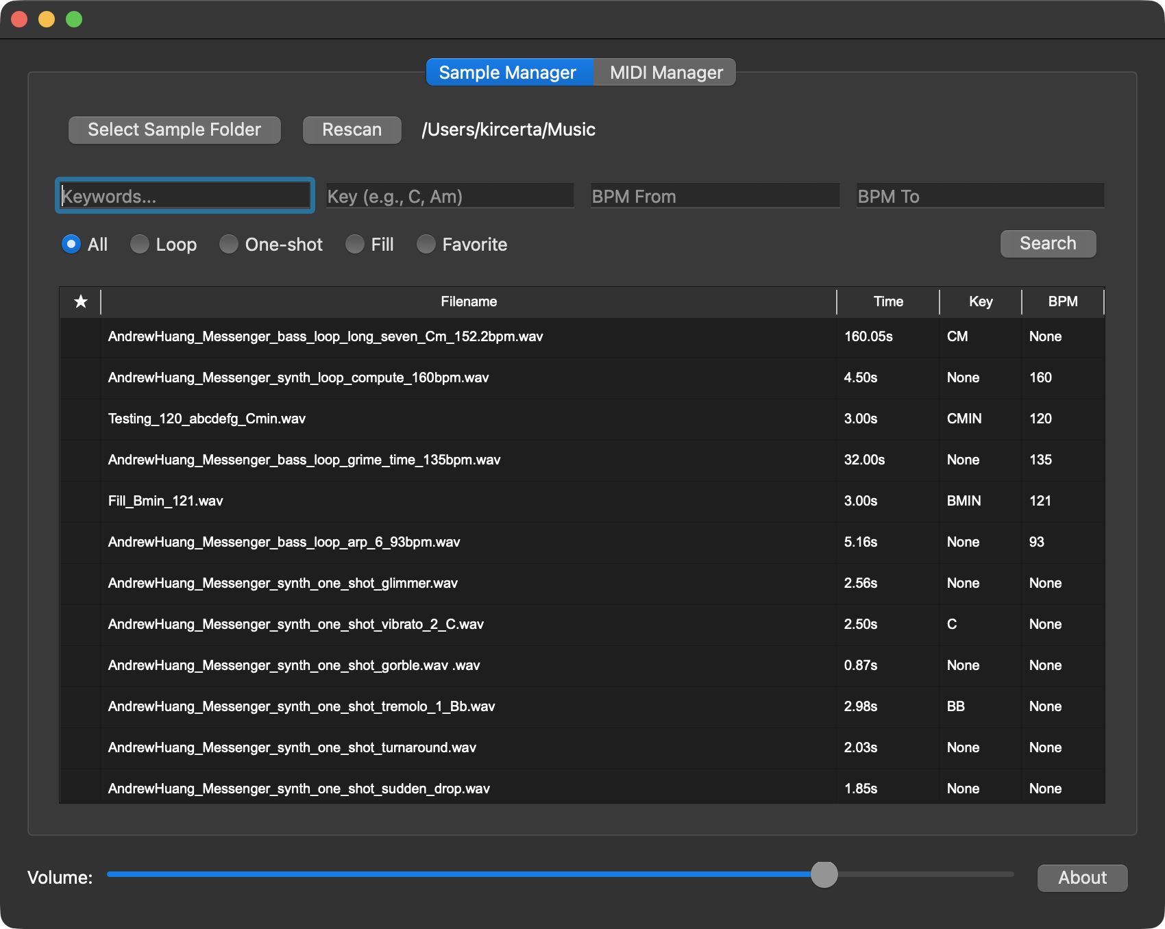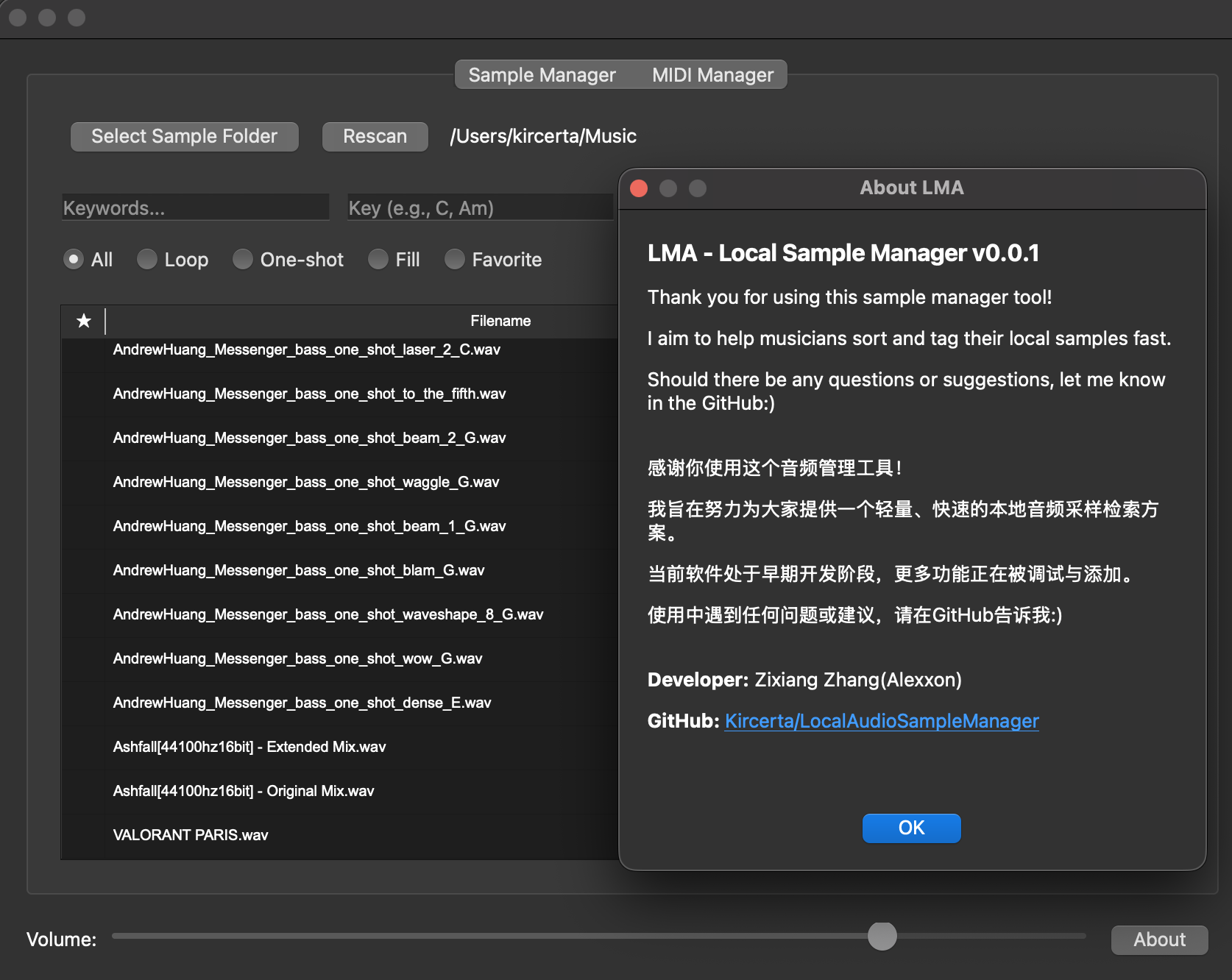 管理器名字暂定LMA。当前版本支持拖拽文件操作和按loop/one-shot的检索方式,也支持输入关键词搜索。我尽可能的在不被发律师函的情况下让它和某在线采样库操作思路足够相似,让大家上手就能用。不过我也写了操作指南,在GitHub的项目页面就有。我测试的时候暂时没遇到bug,有的话也希望大家反馈给我,我去修。同时,下一个版本我会加入更多打tag的方式,并优化音频预览操作逻辑。