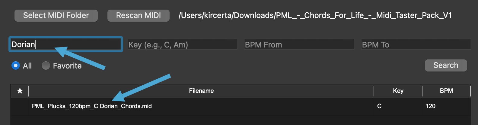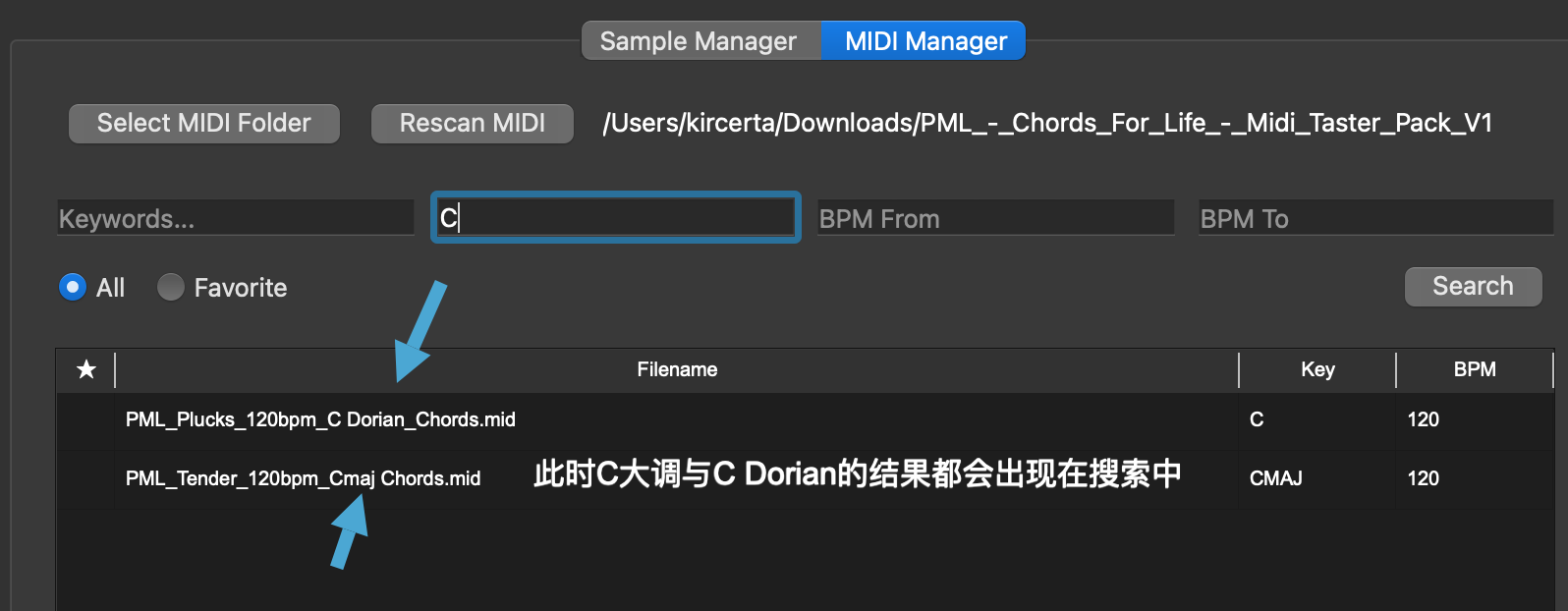• 其它类似Lydian,Dorian等调式的搜索可以在Keywords处进行,或者直接以大调的方式搜索,然后在结果中寻找。具体请看下面的例子。