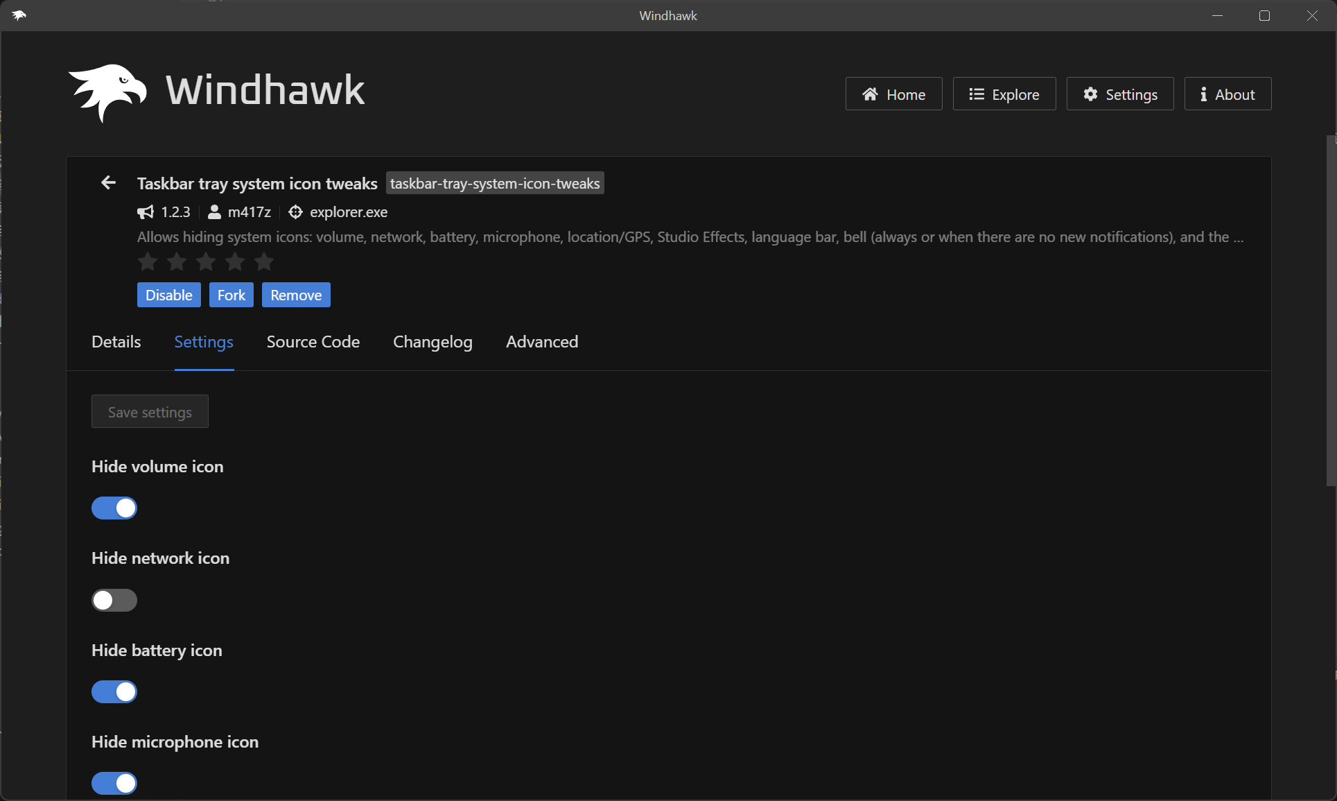 还有一个可以定制任务栏的软件可以推荐给大家,叫Windhauk。这个软件类似Tapermonkey只是一个平台,其内部可以承载很多的Mod帮助更深度的定制Windows的使用。那我个人举例,我对系统的外观有一点偏执,不希望看到的东西就不想看到(这个我也会在MacOS的软件介绍里同样给出我的解决方案)。因此,我选择隐藏任务栏里的一些图标。但电源,网络还有音量这三个图标我发现就算修改注册表或者唤起过去Windows10遗留的设置都无法做到。而Windhauk能帮助我解决这个问题。使用到的mod也在下图中一并供各位参考了。